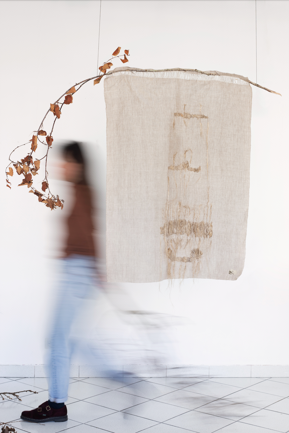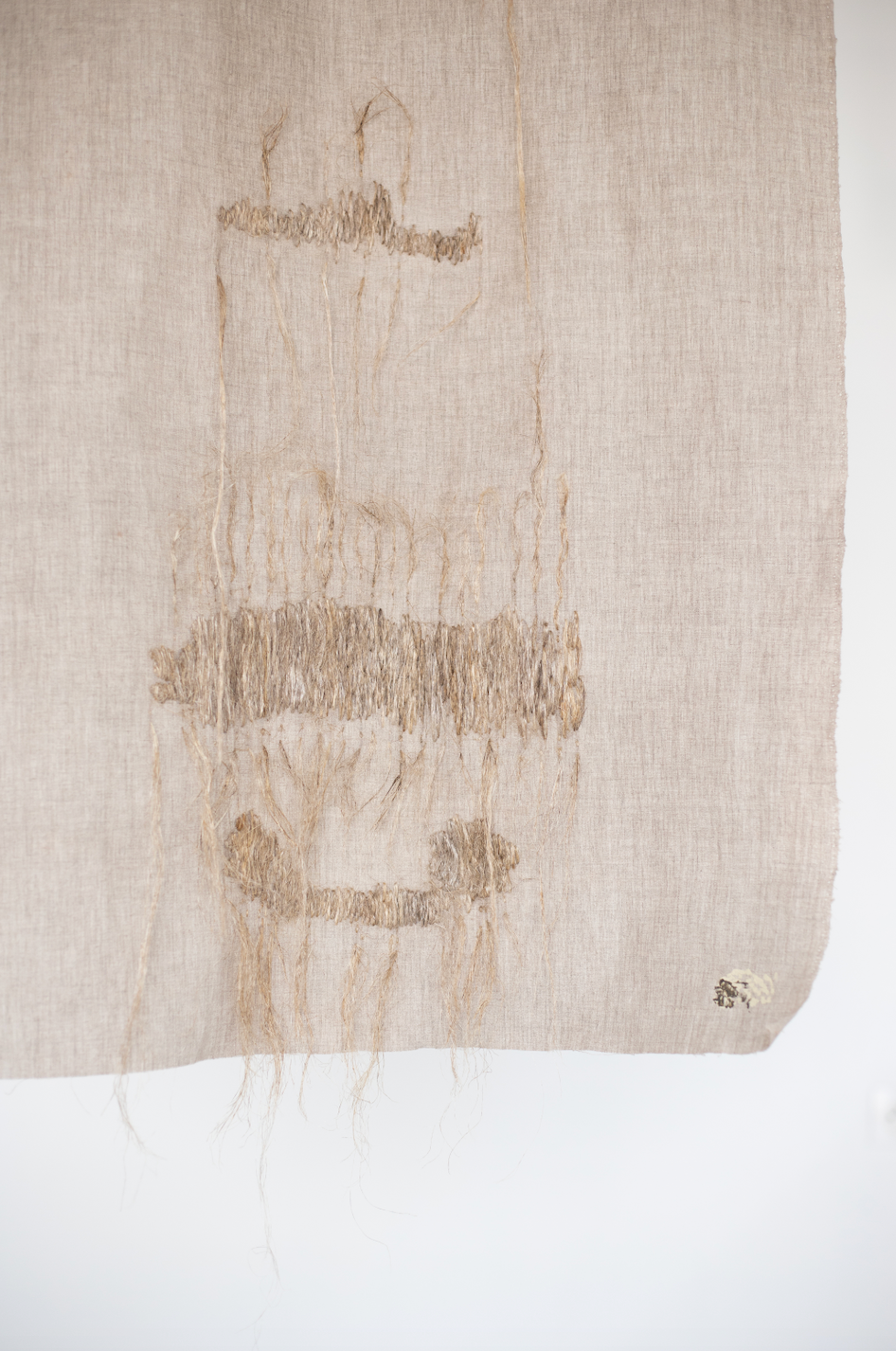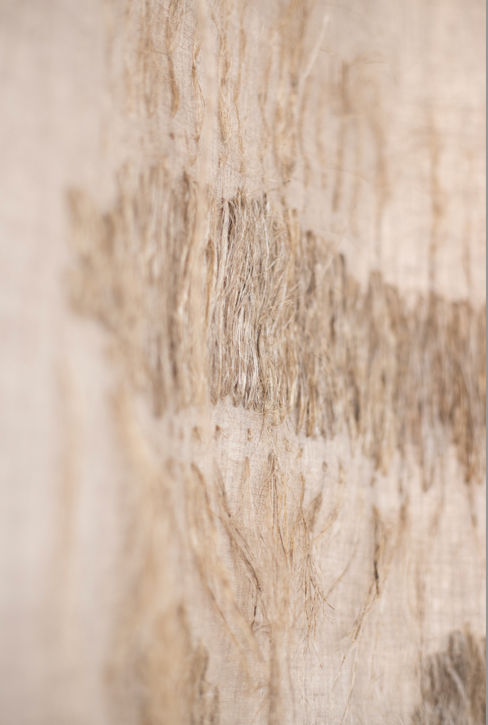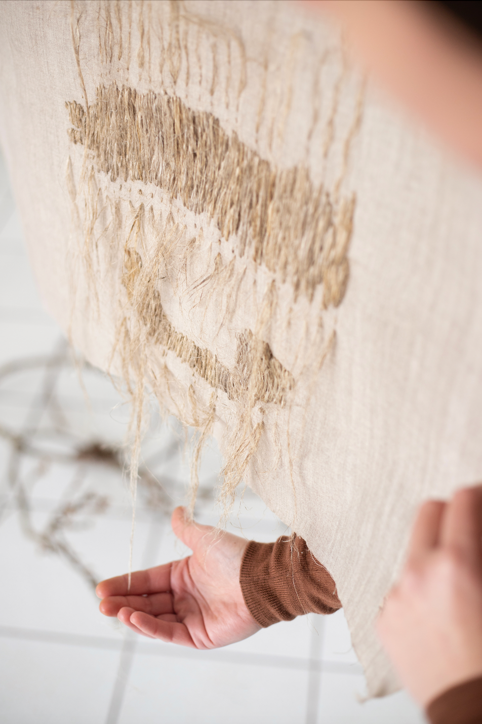 À travers elle, je retranscris les paroles de tisserands d’aujourd’hui et d’hier. Ce n’est pas le savoir-faire en lui qui m’intéresse mais les liens, les relais qu’il permet entre les individus à travers le temps. L’échange de paroles, d’usages influence le receveur dans sa manière de créer et de penser, qui lui-même transmet plus tard. Il y a un avant et un après grâce à ce dialogue. Les œuvres illustrent les vestiges, bribes de ces paroles et le fil qui s’étire vers un futur, vers une nouvelle écriture.