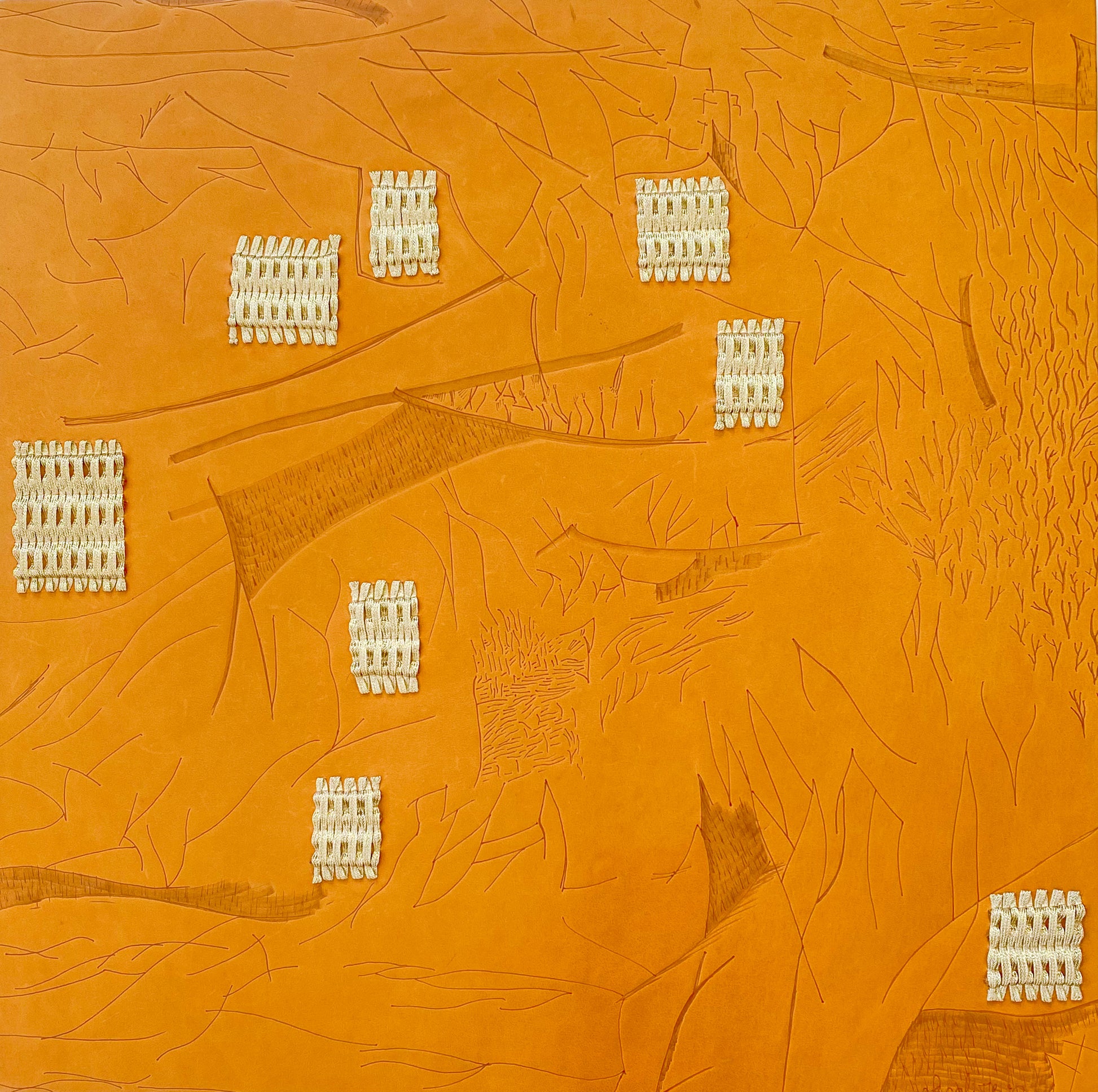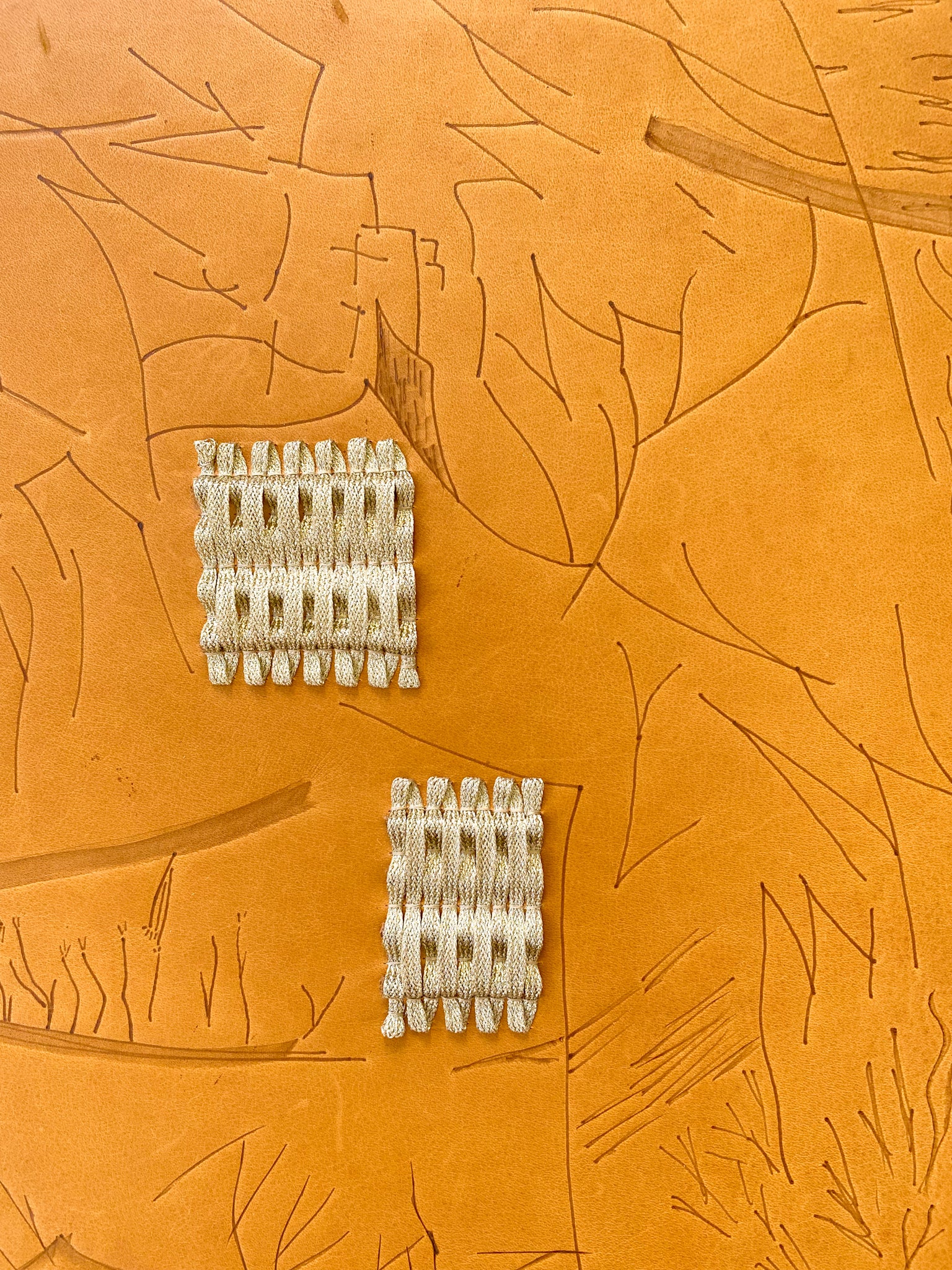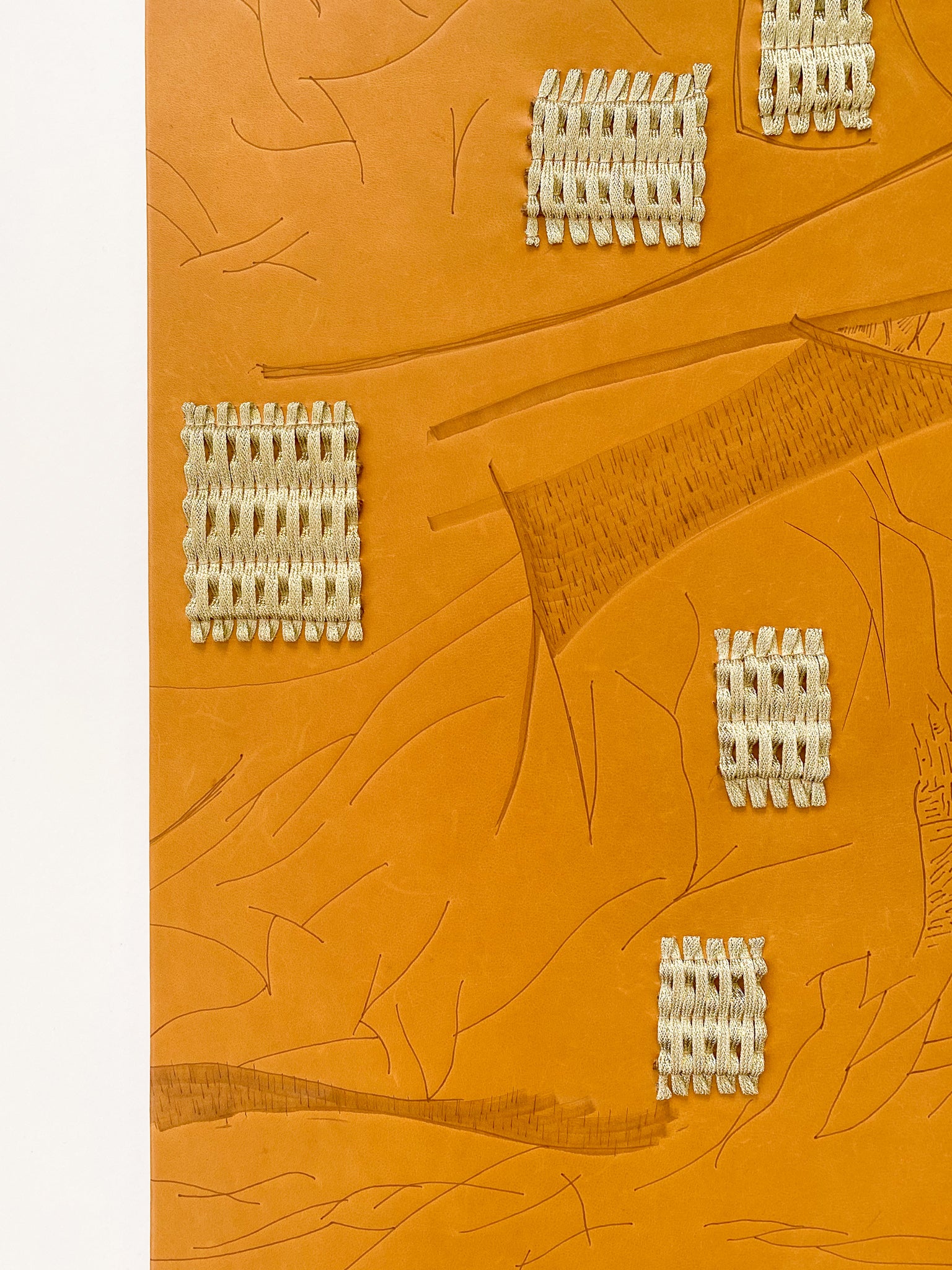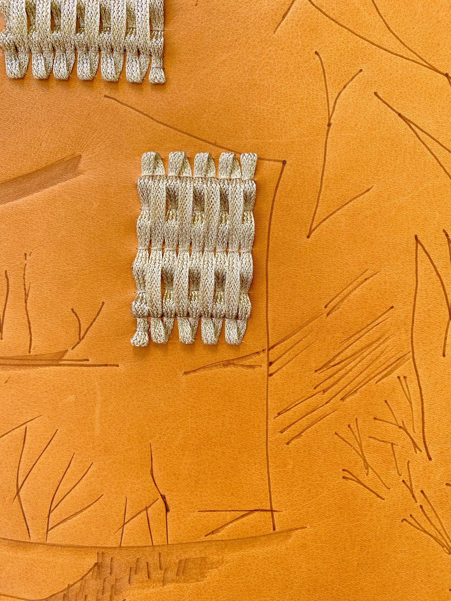 Parcouru par les brûlures du pyrograveur, les stigmates de ce cuir provenant des stocks dormants du luxe sont illuminés par des touches d’or. Les marquages à chaud évoquent des traits libres dessinés sur une paroi.