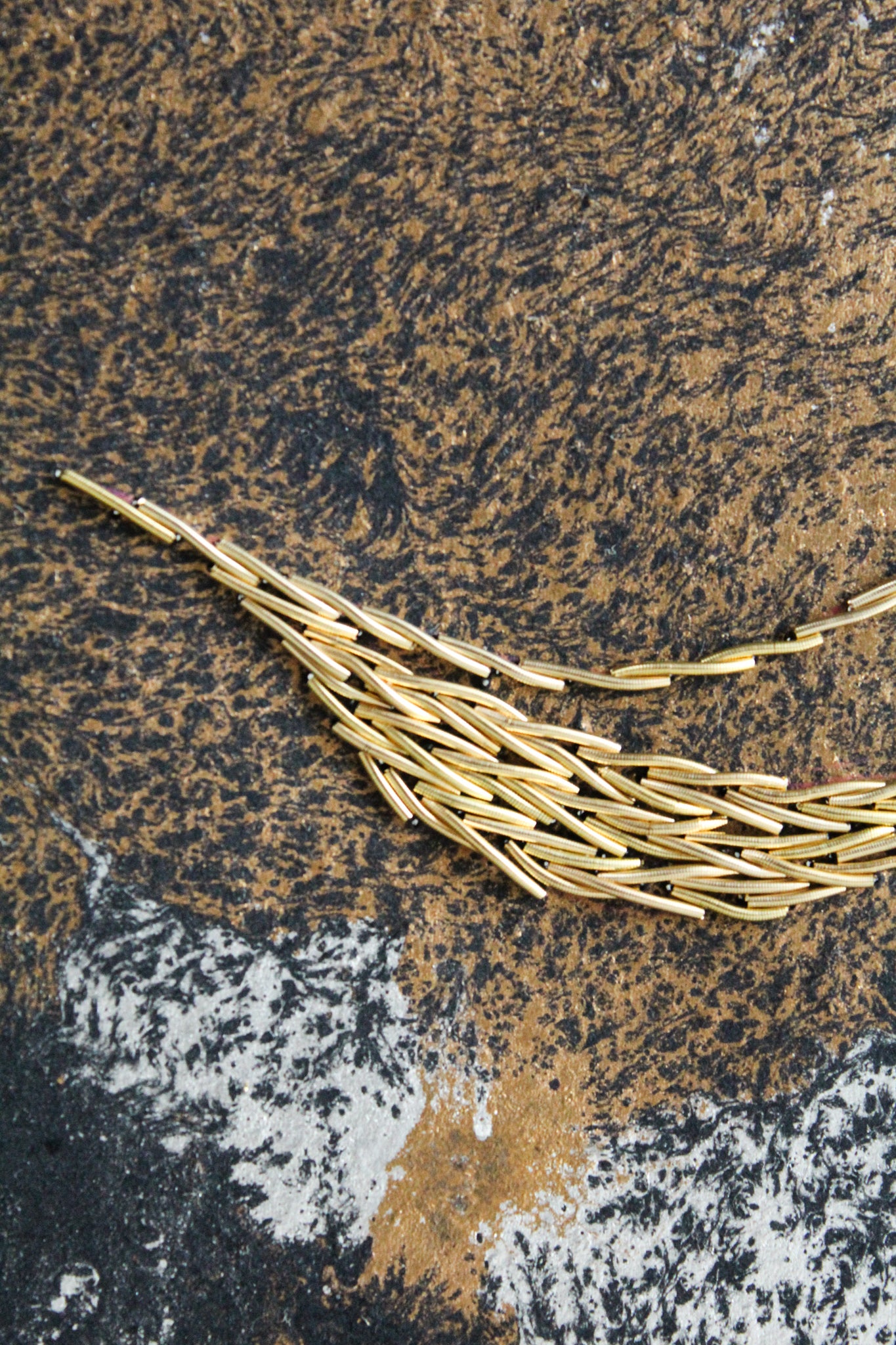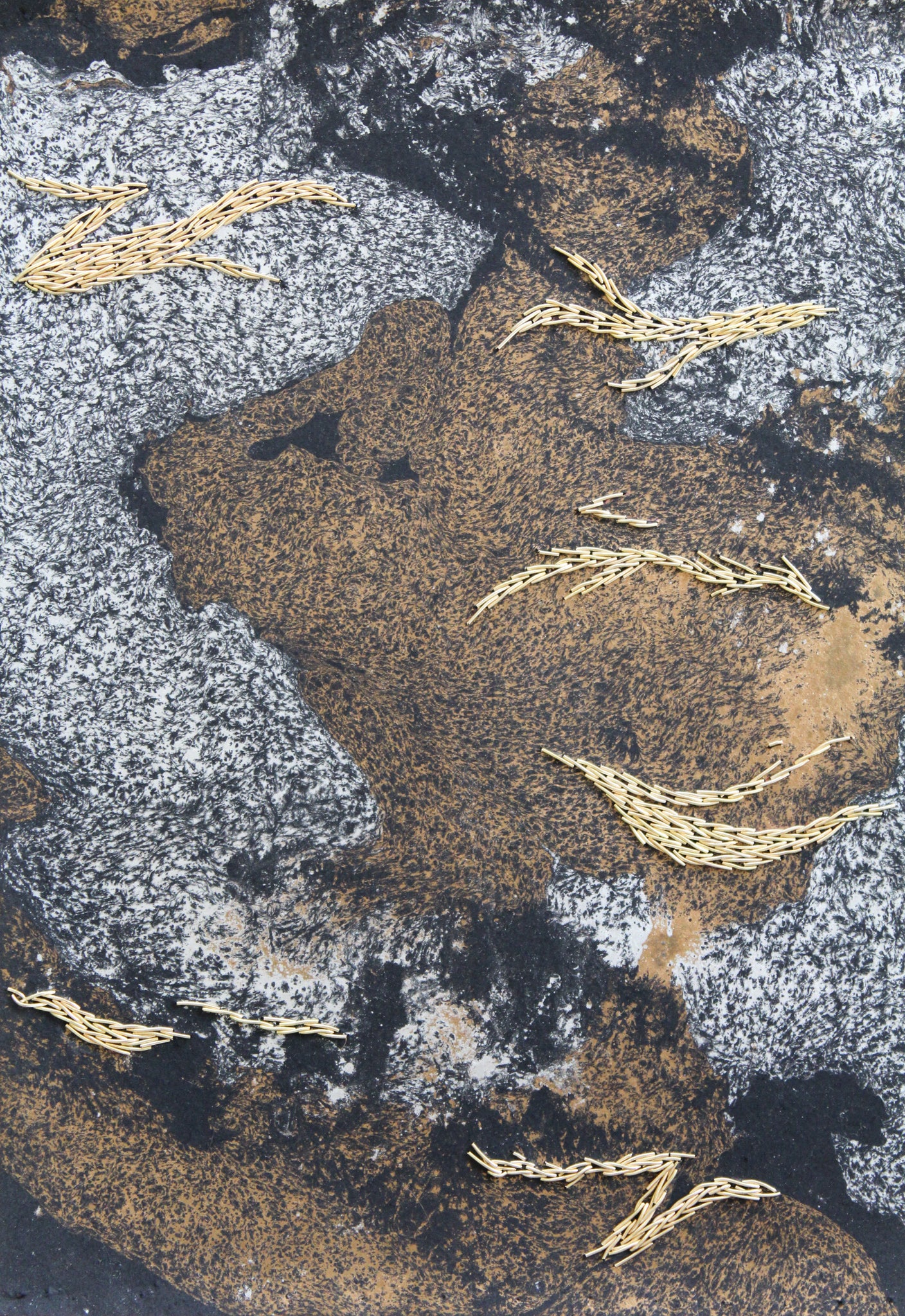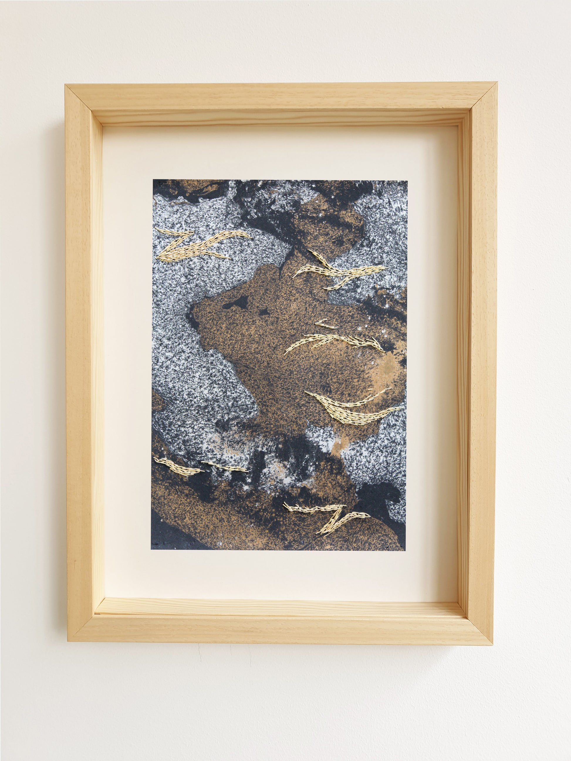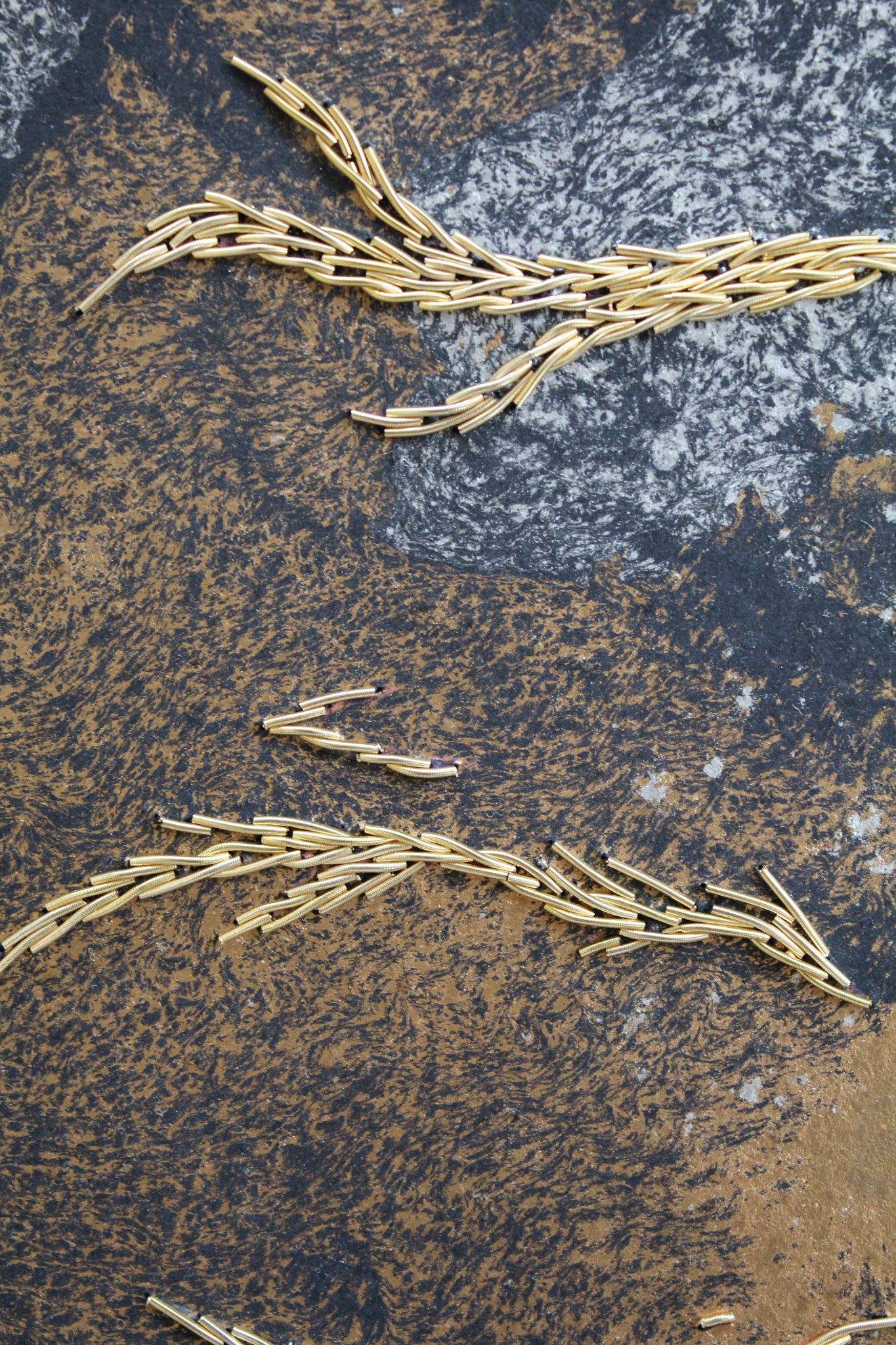 Embroidery on marbled paper. Shades of gold in metallic embroidery take shape among an animated universe.