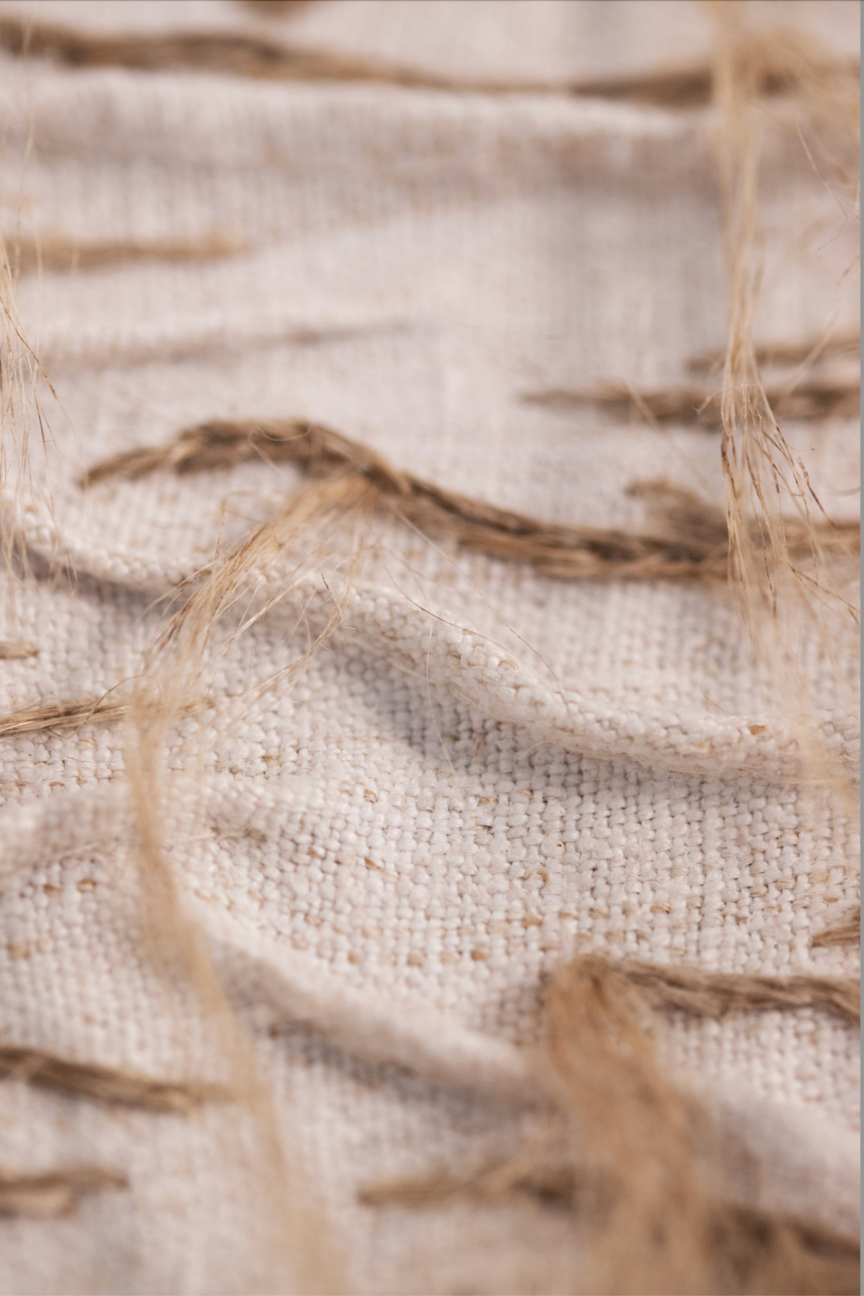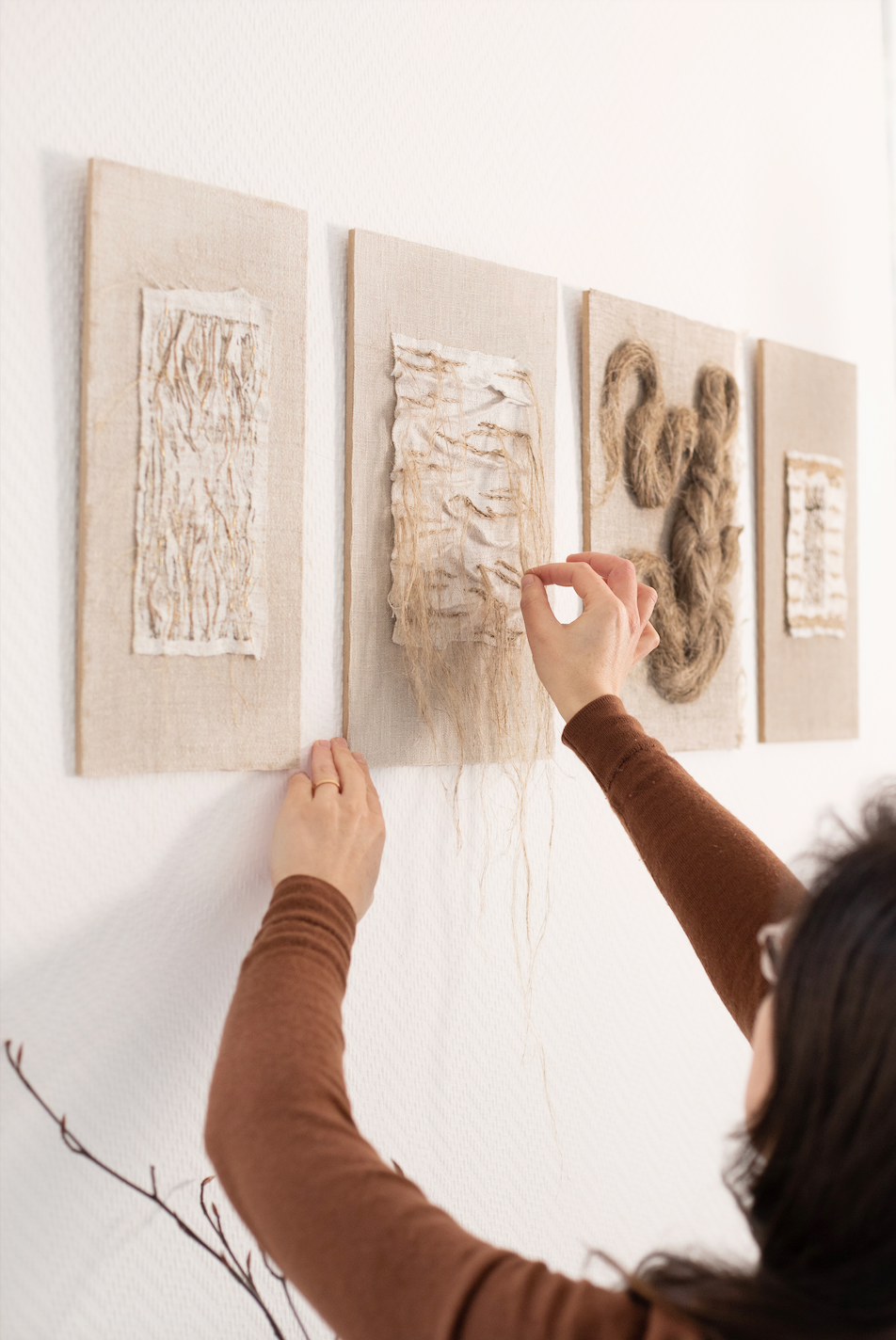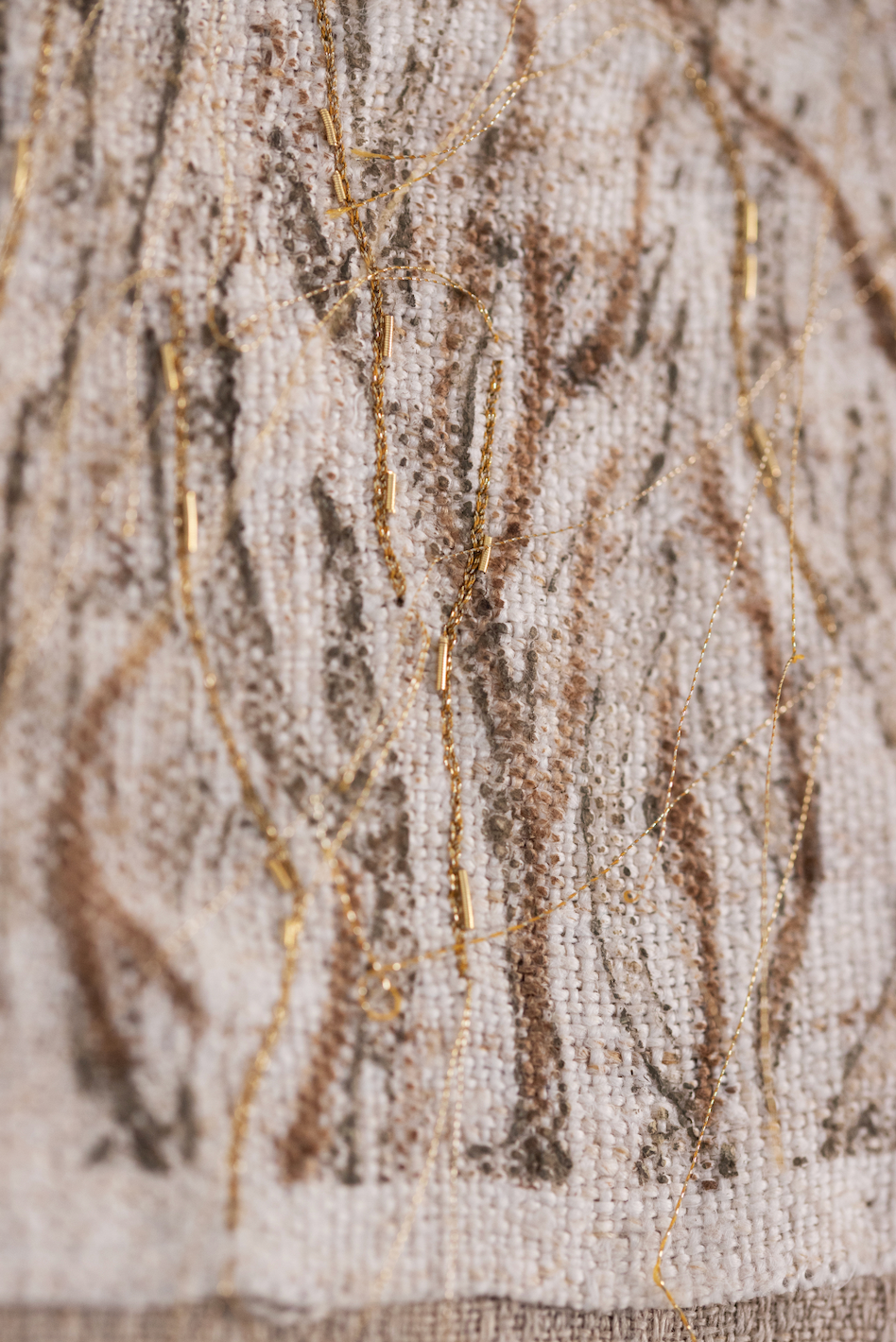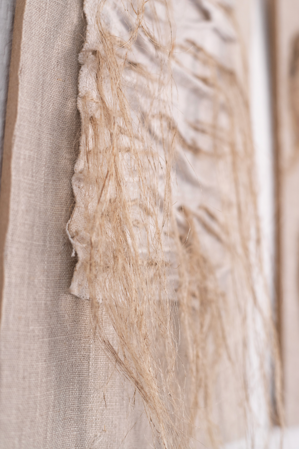 À travers lui, je retranscris les paroles de tisserands d’aujourd’hui et d’hier. Ce n’est pas le savoir-faire en lui-même qui m’intéresse mais les liens, les relais qu’il permet entre les individus à travers le temps. L’échange de paroles, d’usages influence le receveur dans sa manière de créer et de penser, qui lui-même transmet plus tard. Il y a un avant et un après grâce à ce dialogue. Les œuvres illustrent les vestiges, bribes de ces paroles et le fil qui s’étire vers un futur, vers une nouvelle écriture.