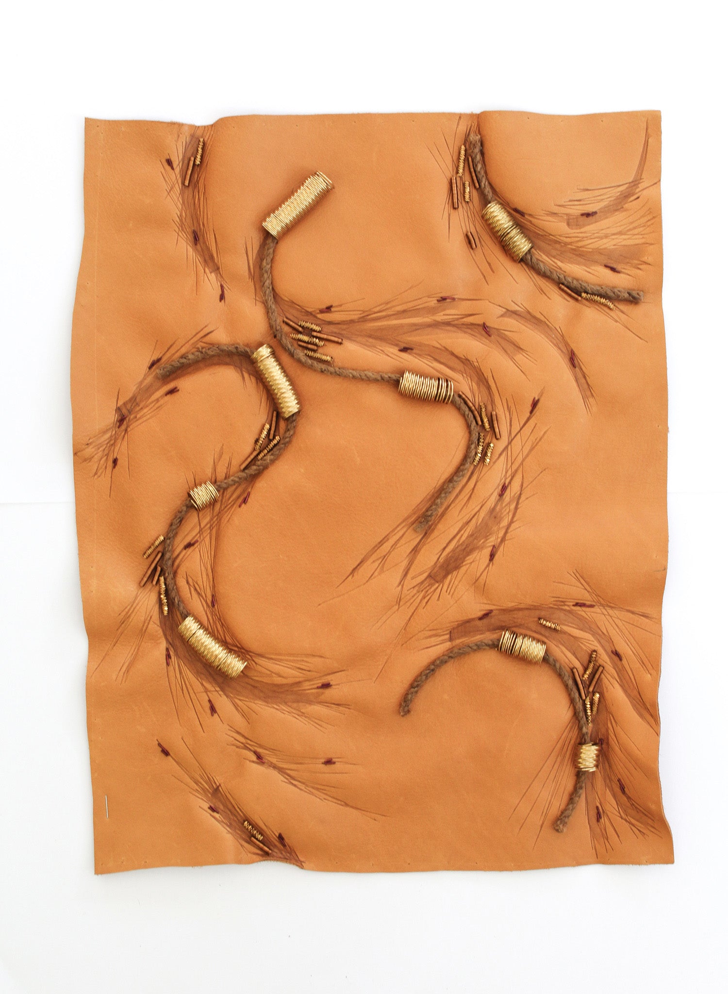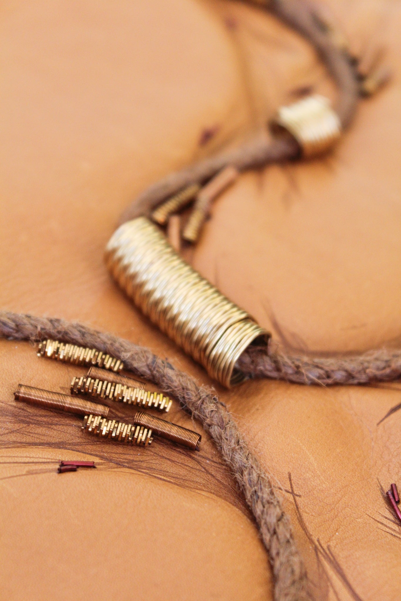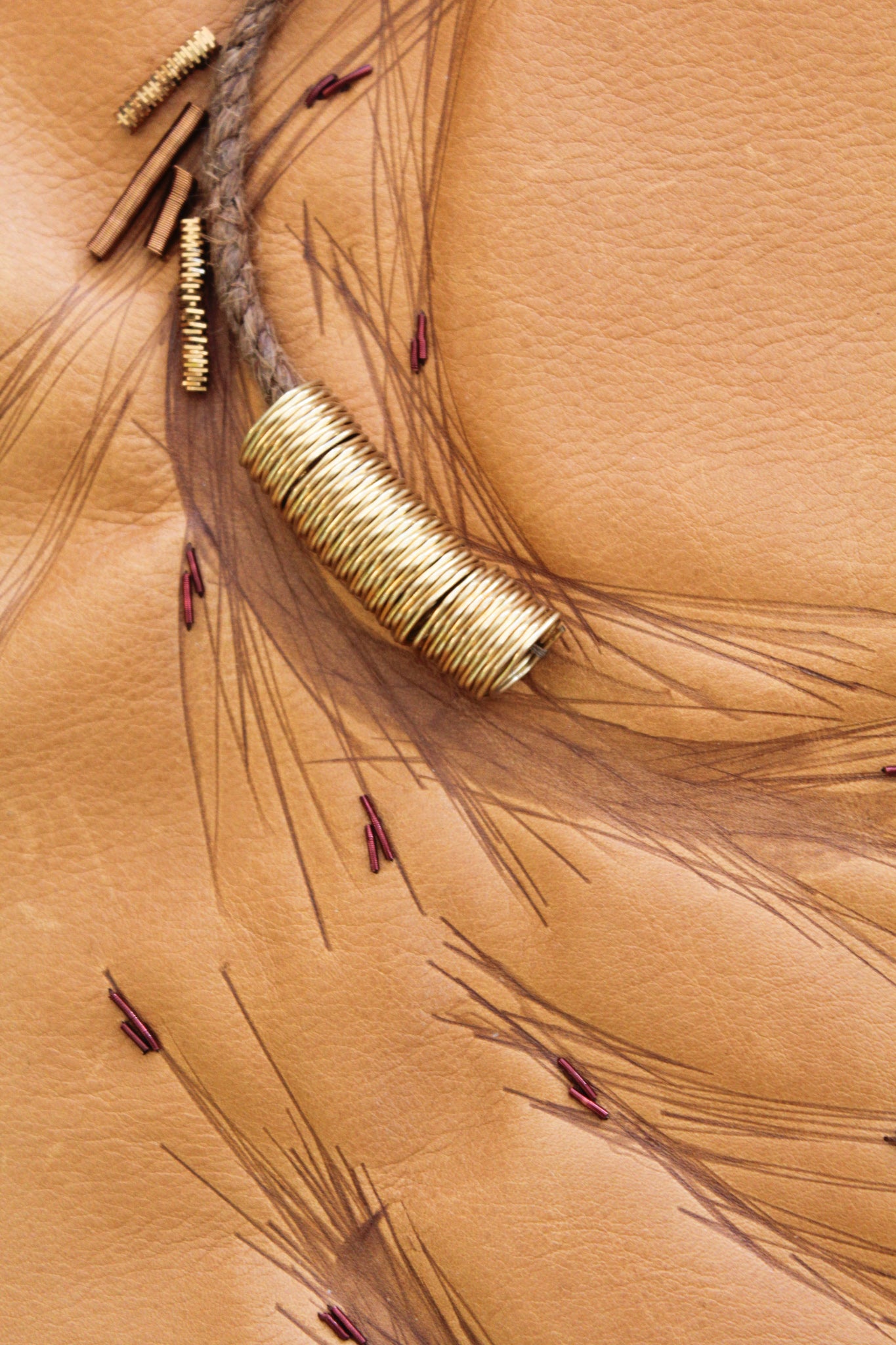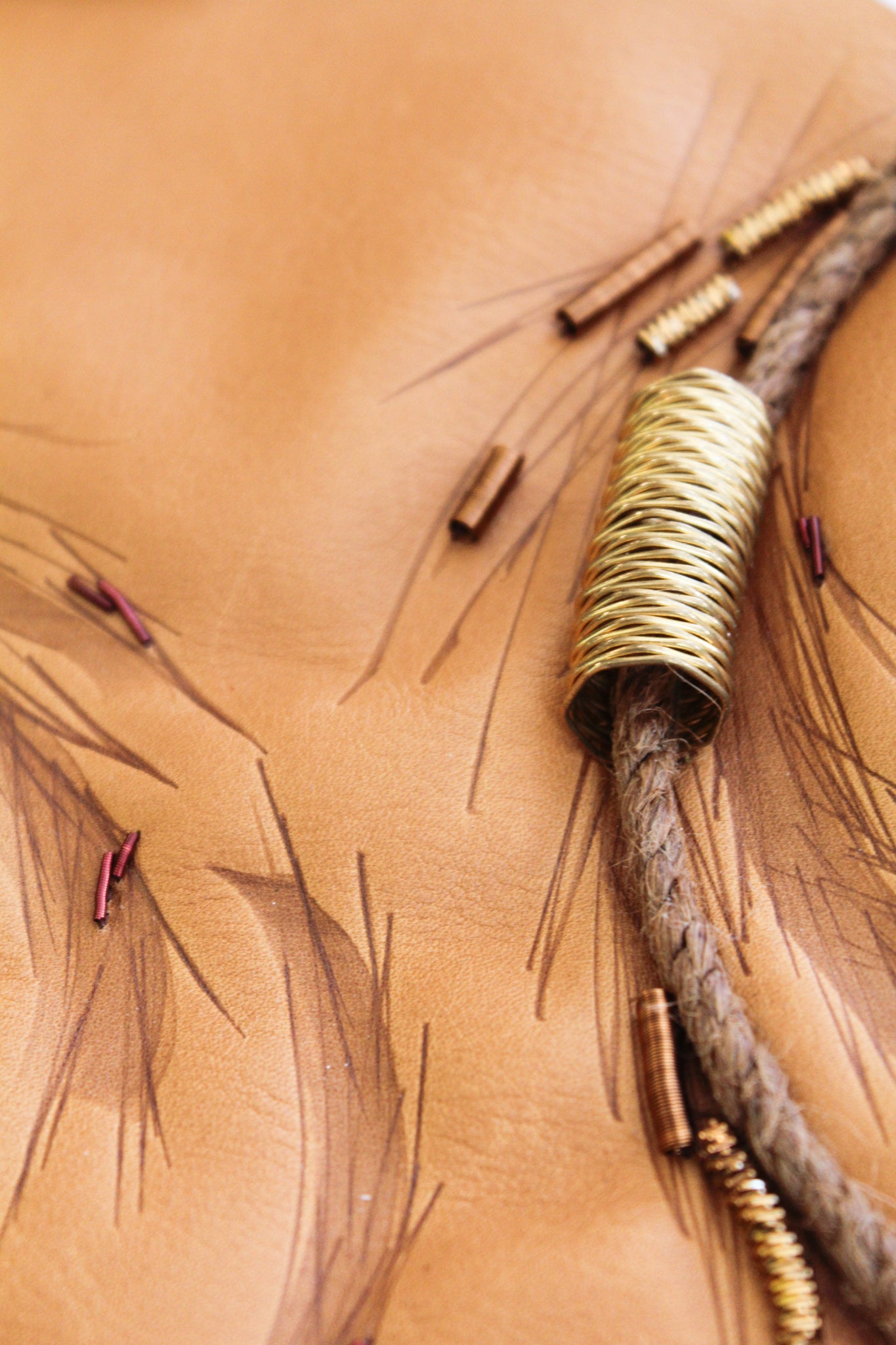 Ce cuir est parcouru par les cicatrices laissées par le pyrograveur. Telles des empreintes construites par le temps qui passe, ces stigmates sont illuminés par des touches d’or. Cannetilles frisées et lisses accompagnent les ondulations. Telles des racines qui émanent du sol, des bouts de cordes coco apparaissent et sont enlacées par la puissance de la cannetille XXL.