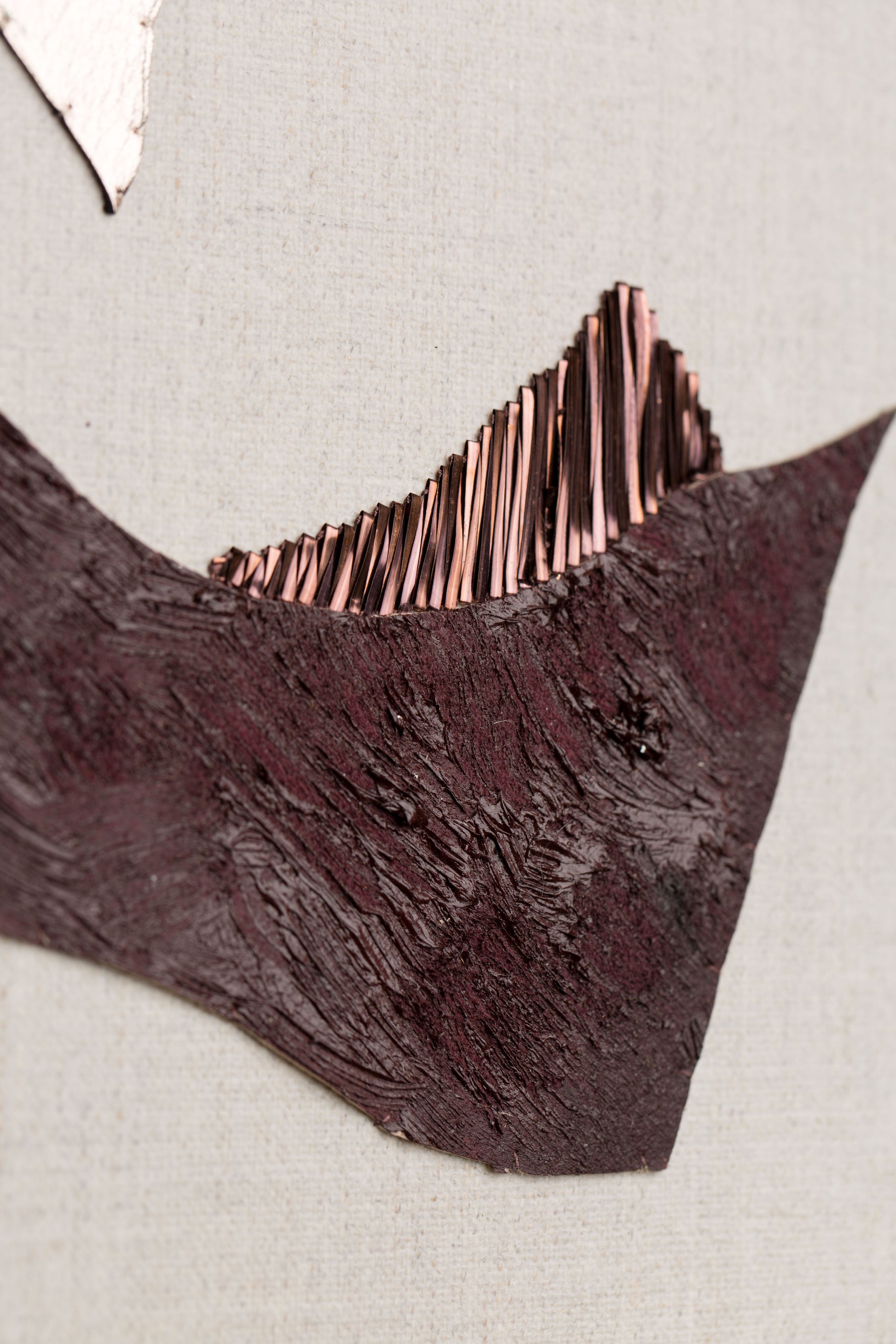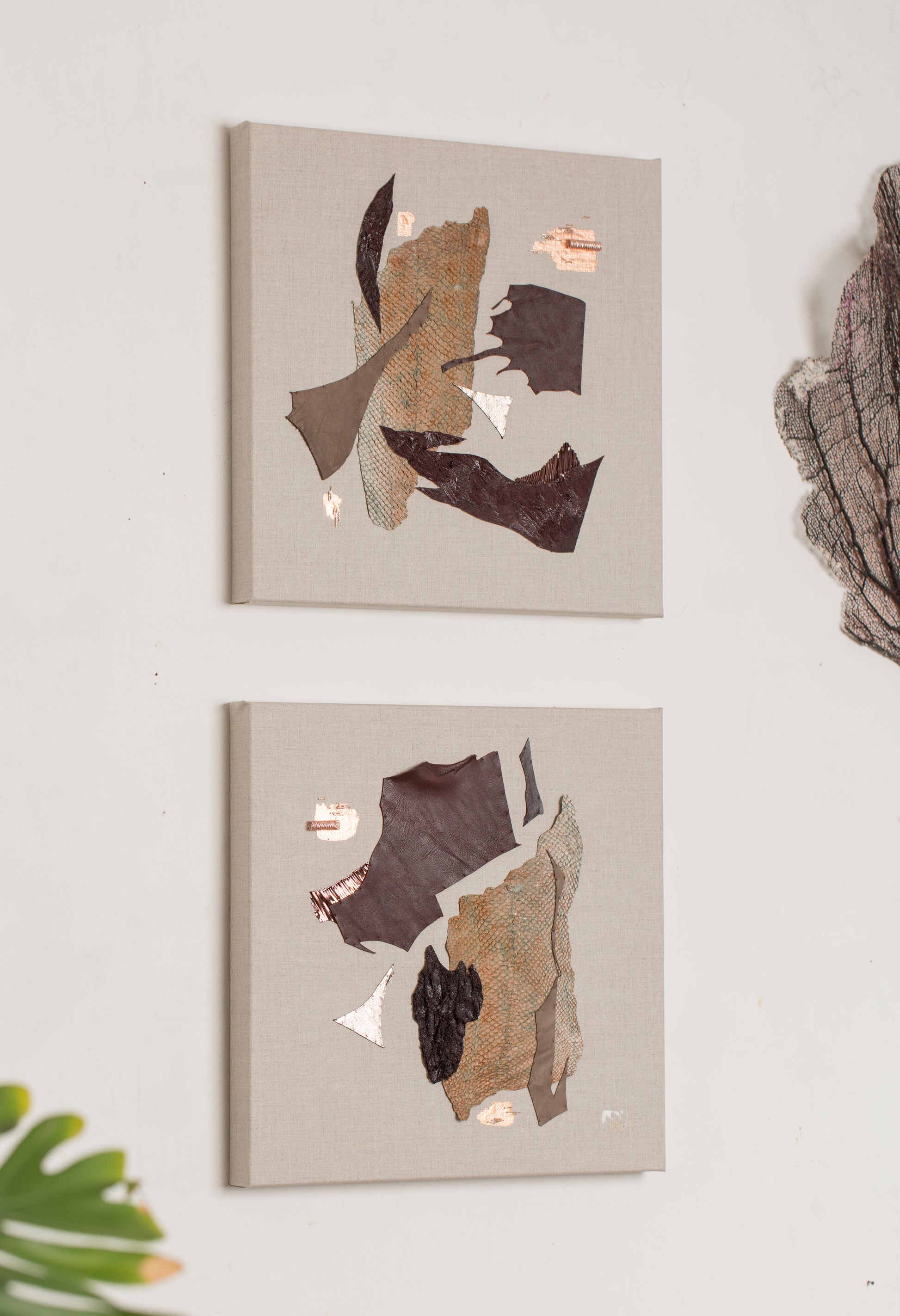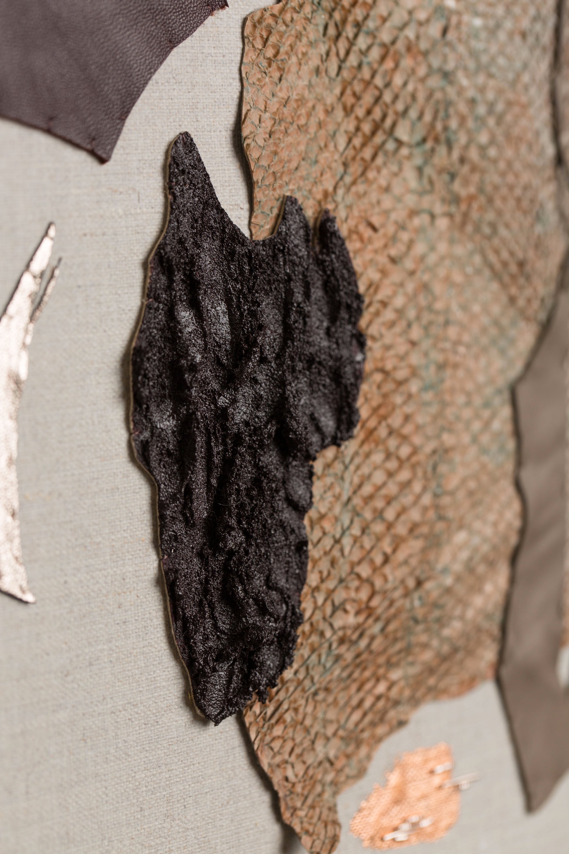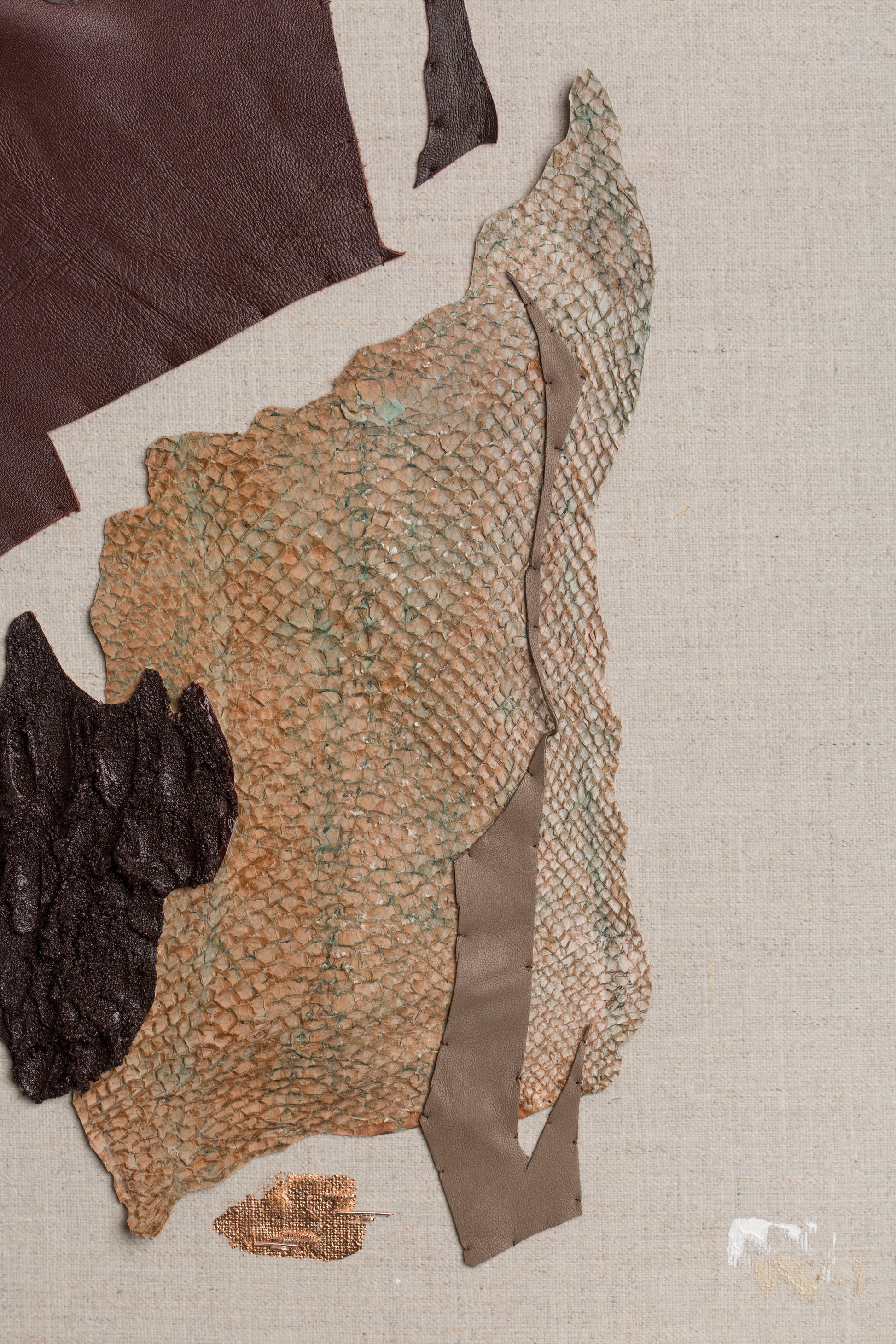 Tels des trésors, je collecte écorces, coquilles, pierres et les entrepose à l'atelier. Ils cohabitent avec les cannetilles, les cuirs, les chanvres pendant des semaines, des mois.