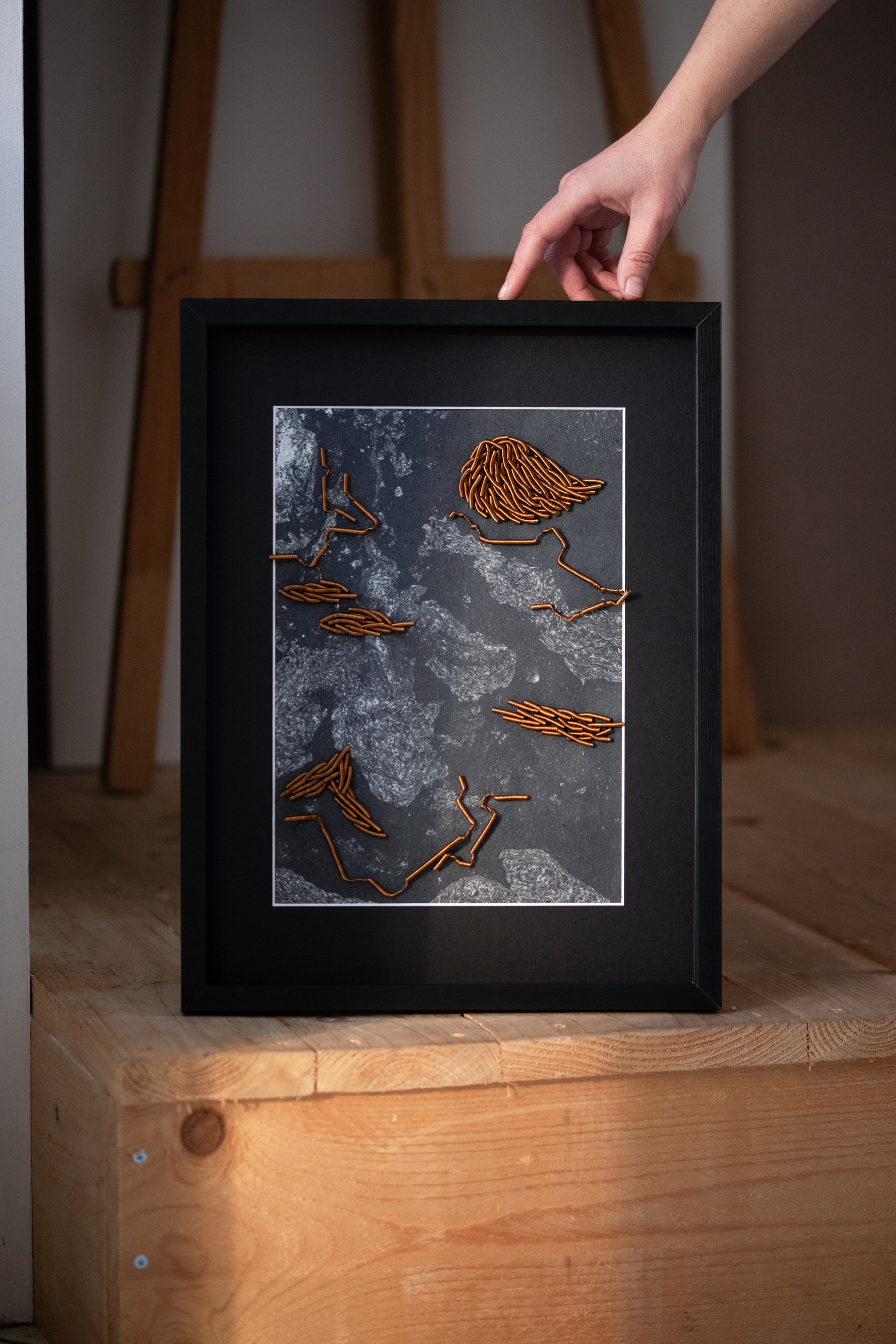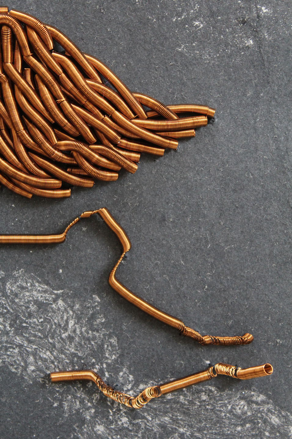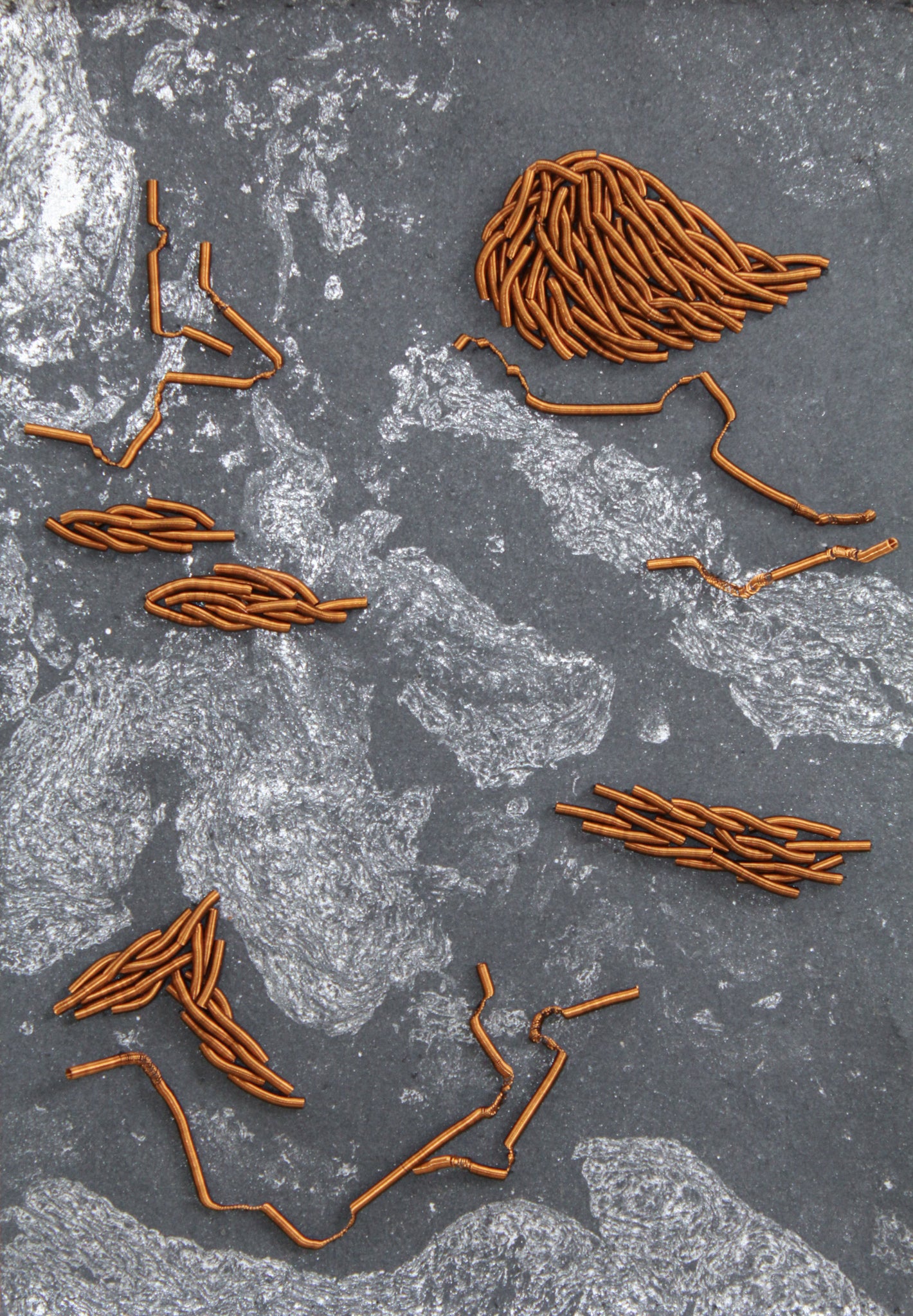Camaïeu cuivré en broderie métallique sur papier marbré noir et argent. Les cannetilles se déploient telles des fragments, des îlots tantôt massifs, tantôt aériens, fins, discontinus.