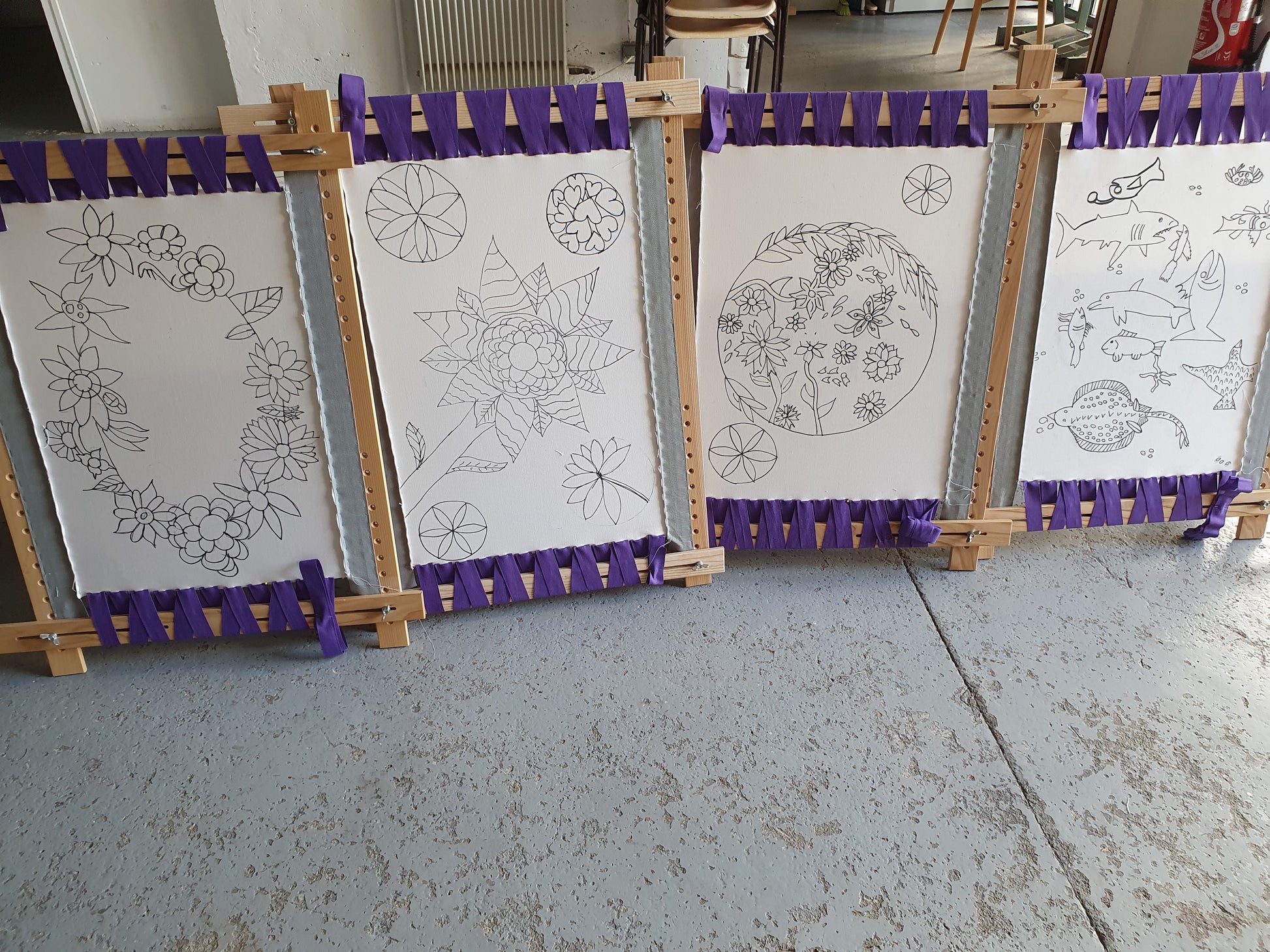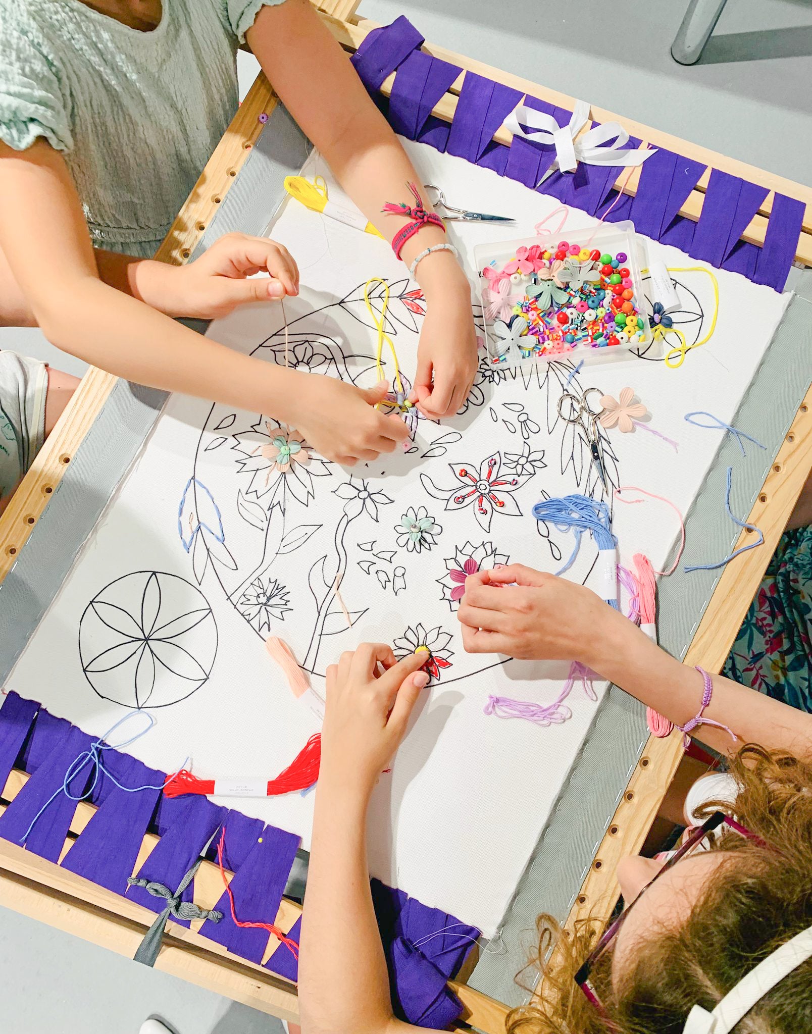Pendant cet atelier, vous découvrirez ensemble quelques points de broderie, fils et fournitures diverses (perles, fleurs en tissu, etc). Vous colorez avec ces matières progressivement le dessin de l’enfant imprimé sur textile. Une tenture murale alliant dessin et broderie sera le résultat de ce temps de création.