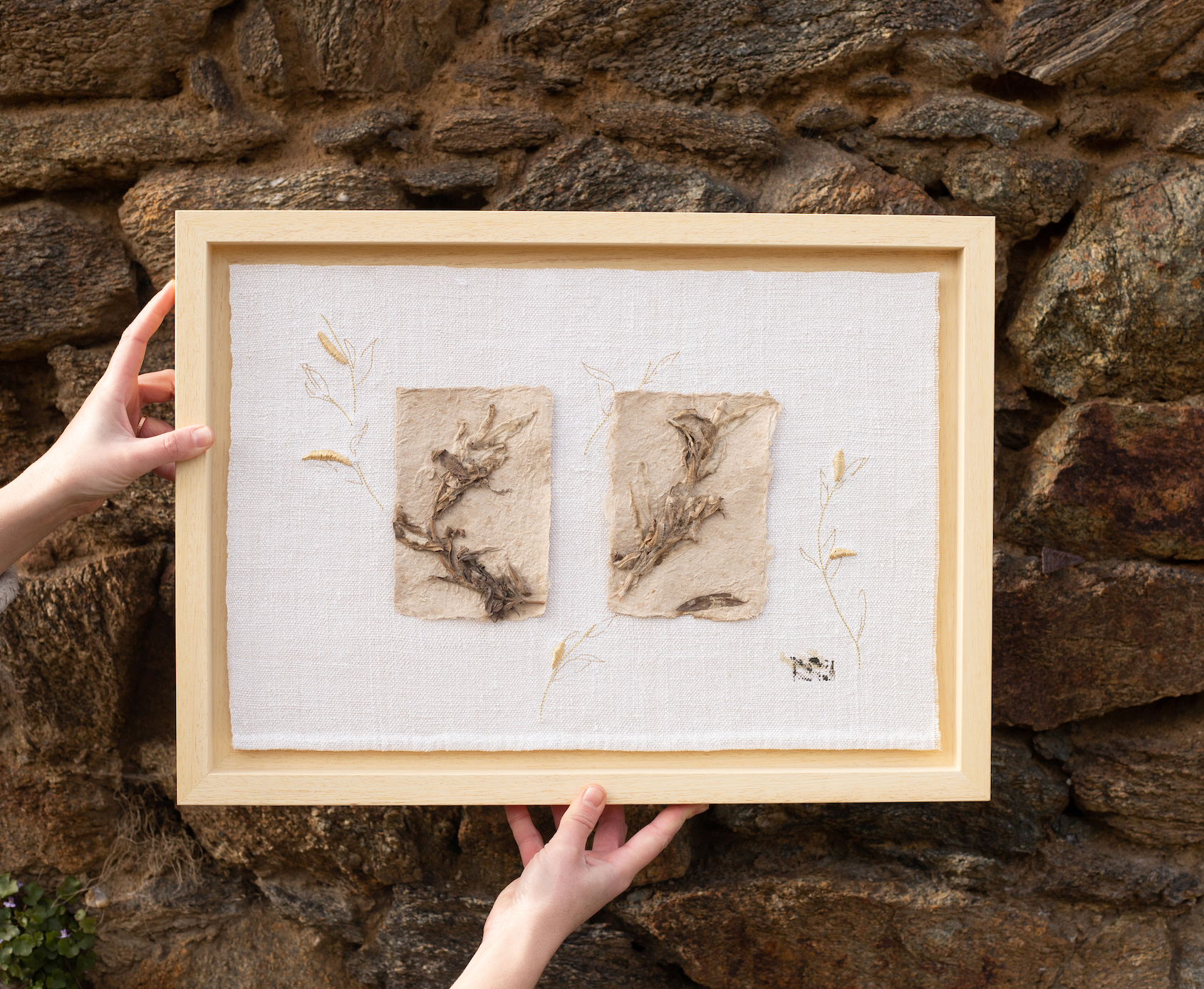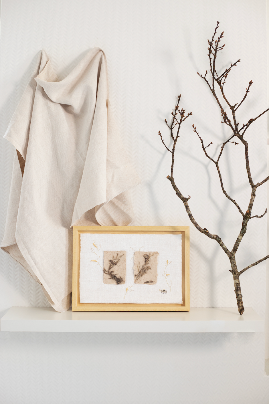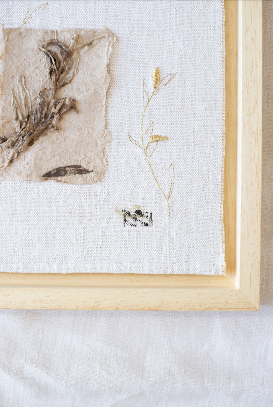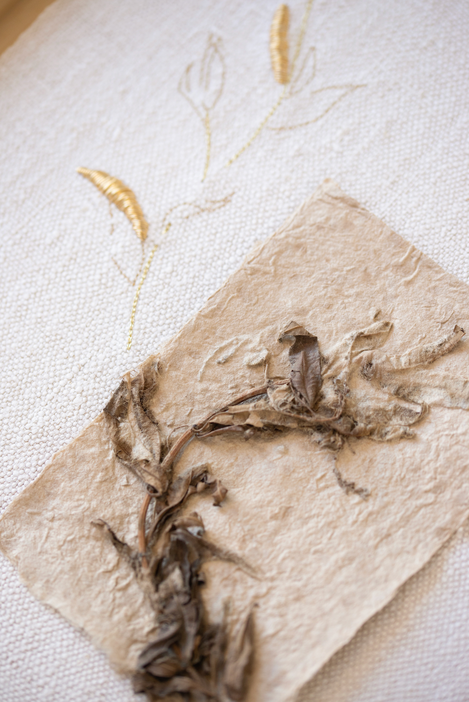 Par des gestes vifs et en légères épaisseurs, je pose sur le tissu la peinture acrylique et le brou de noix. La cannetille et les fils sillonnent ces zones, fourmillent. La clarté du métal rencontre l’obscurité des couches picturales. Les végétaux cueillis en bord de route ou au fond d’un jardin deviennent sculpture et objet de regard.