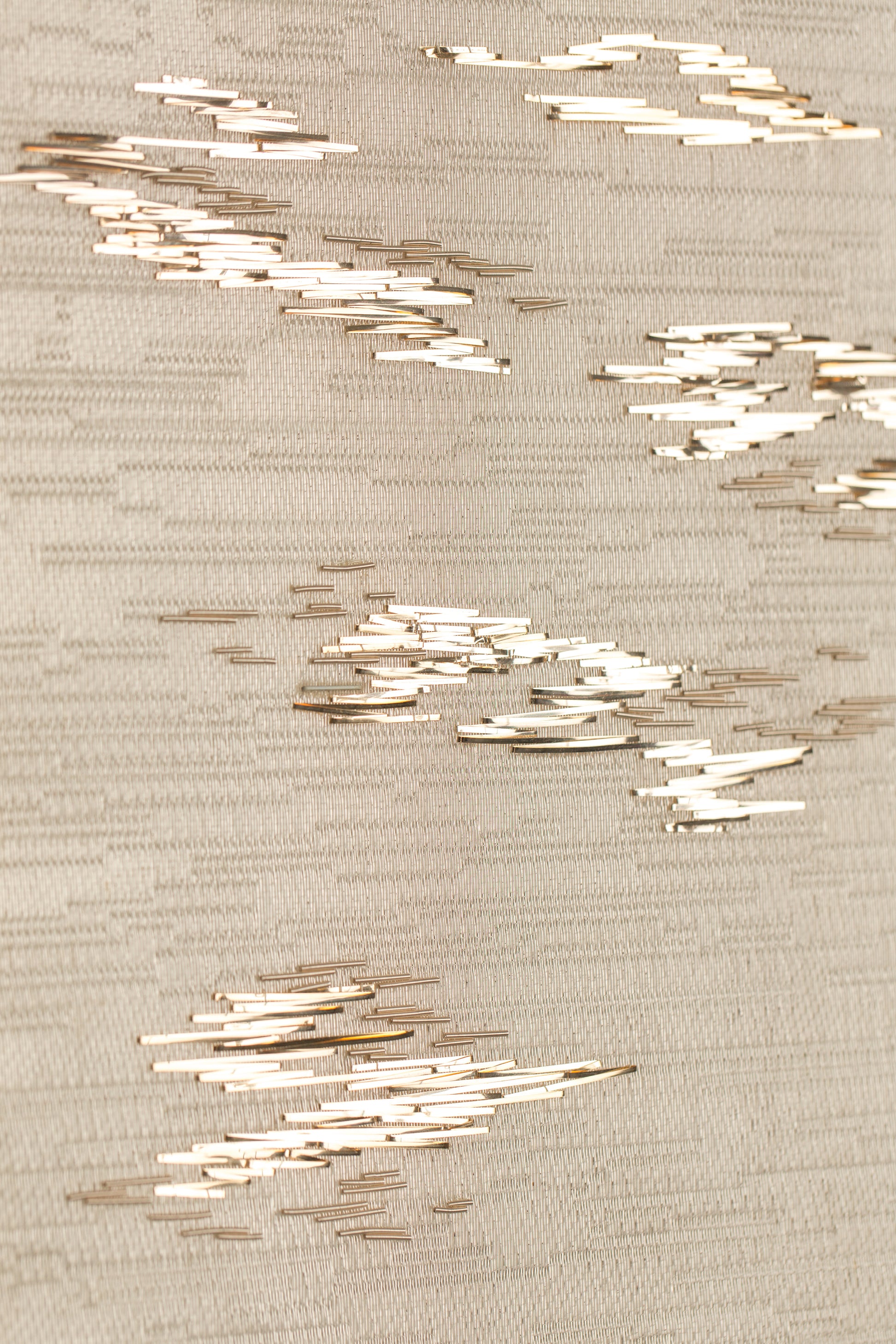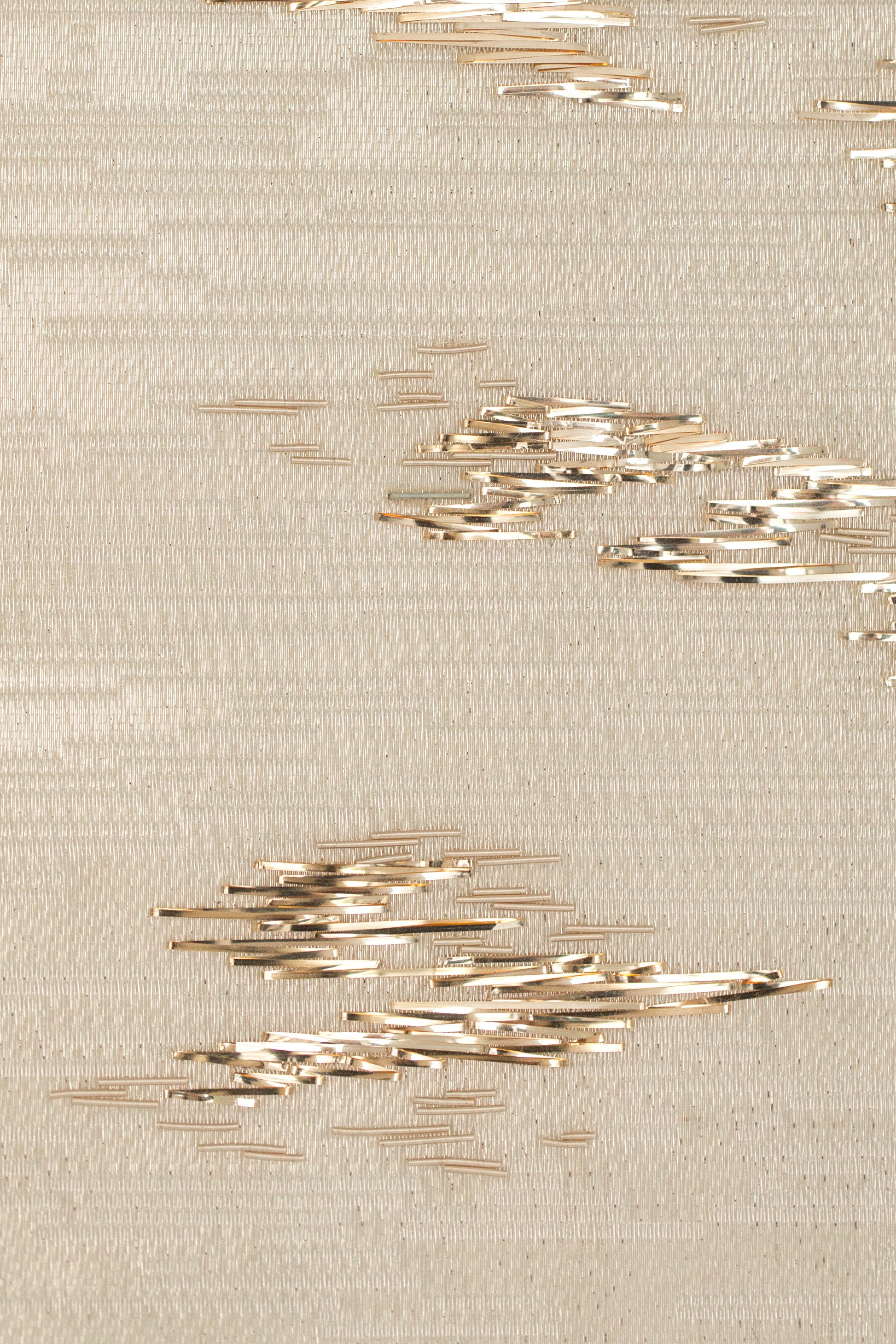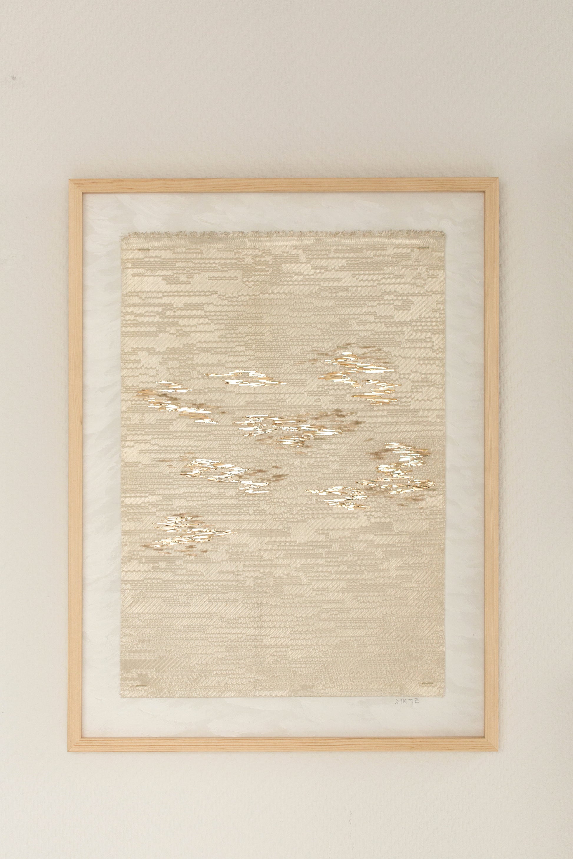 Le tissage brodé est placé sur une réhausse. Le fond est peint en ton sur ton de blanc avec des gestes rythmés de bourrasques ou d'écumes.